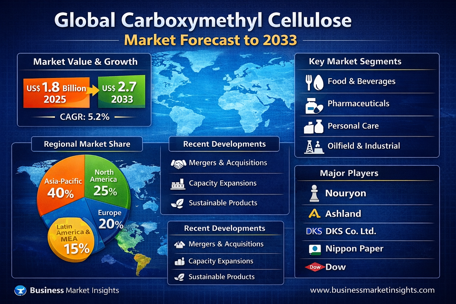 According to the market research report, the global carboxymethyl cellulose market was valued at US$1.8 billion in 2025 and is projected to reach US$2.7 billion by 2033, growing at a CAGR of 5.2% from 2026 to 2033. The market growth is driven by rising demand from processed foods, pharmaceutical formulations, personal care products, and industrial applications. Companies are focusing on strategic initiatives such as product innovation, capacity expansion, and sustainable production to capitalize on market opportunities.