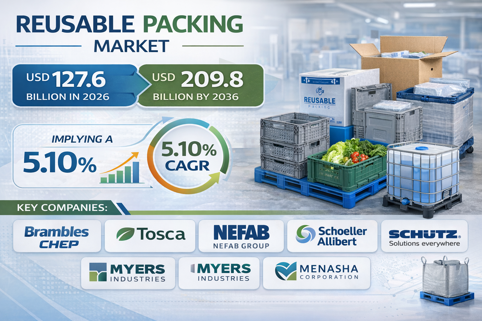 • Top companies Brambles (CHEP); Tosca Ltd.; Nefab Group; Schoeller Allibert; Schütz GmbH & Co. KGaA; Myers Industries; Menasha Corporation