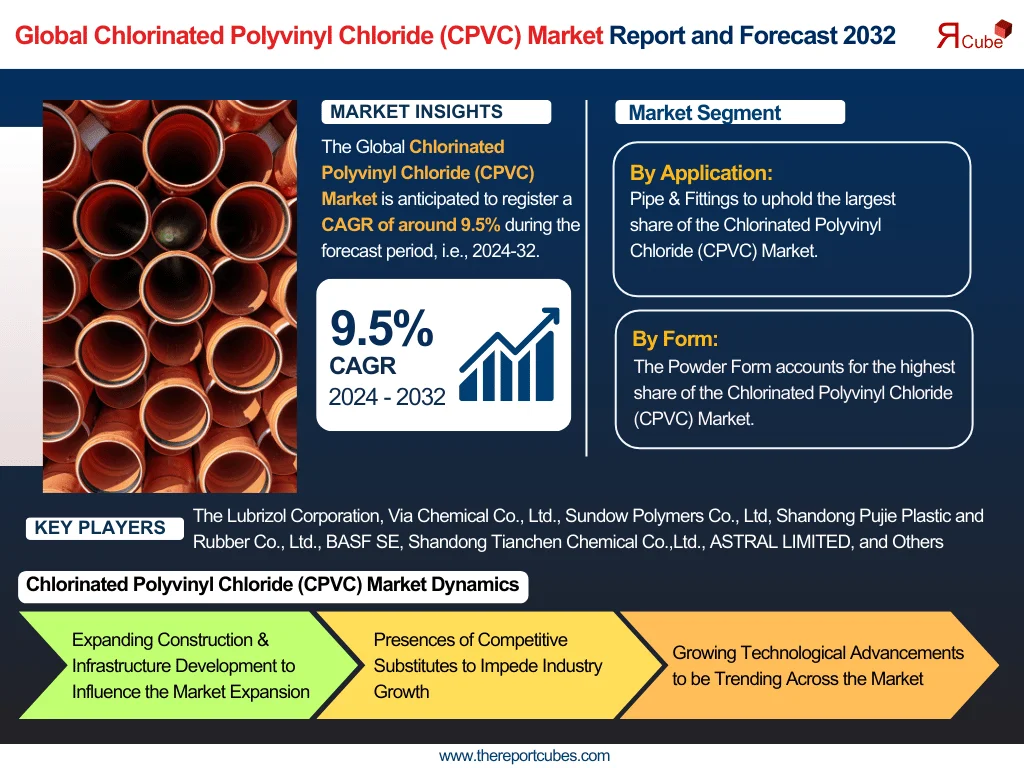 The Report Cube which is one of the leading market research company in UAE expects the Global Chlorinated Polyvinyl Chloride (CPVC) Market to grow at a CAGR of around 9.5% through 2032, as highlighted in their latest research report. The study provides an in-depth analysis of the emerging trends shaping the Global Chlorinated Polyvinyl Chloride (CPVC) Market and offers detailed forecasts for its potential growth during 2024–2032. The report also presents a comprehensive assessment of the competitive landscape, including profiles of leading players, their performance metrics, and recent strategic developments. Additionally, it explores the key market drivers, challenges, opportunities, and provides insights into historical and future revenue trends at the global, regional, and country levels.