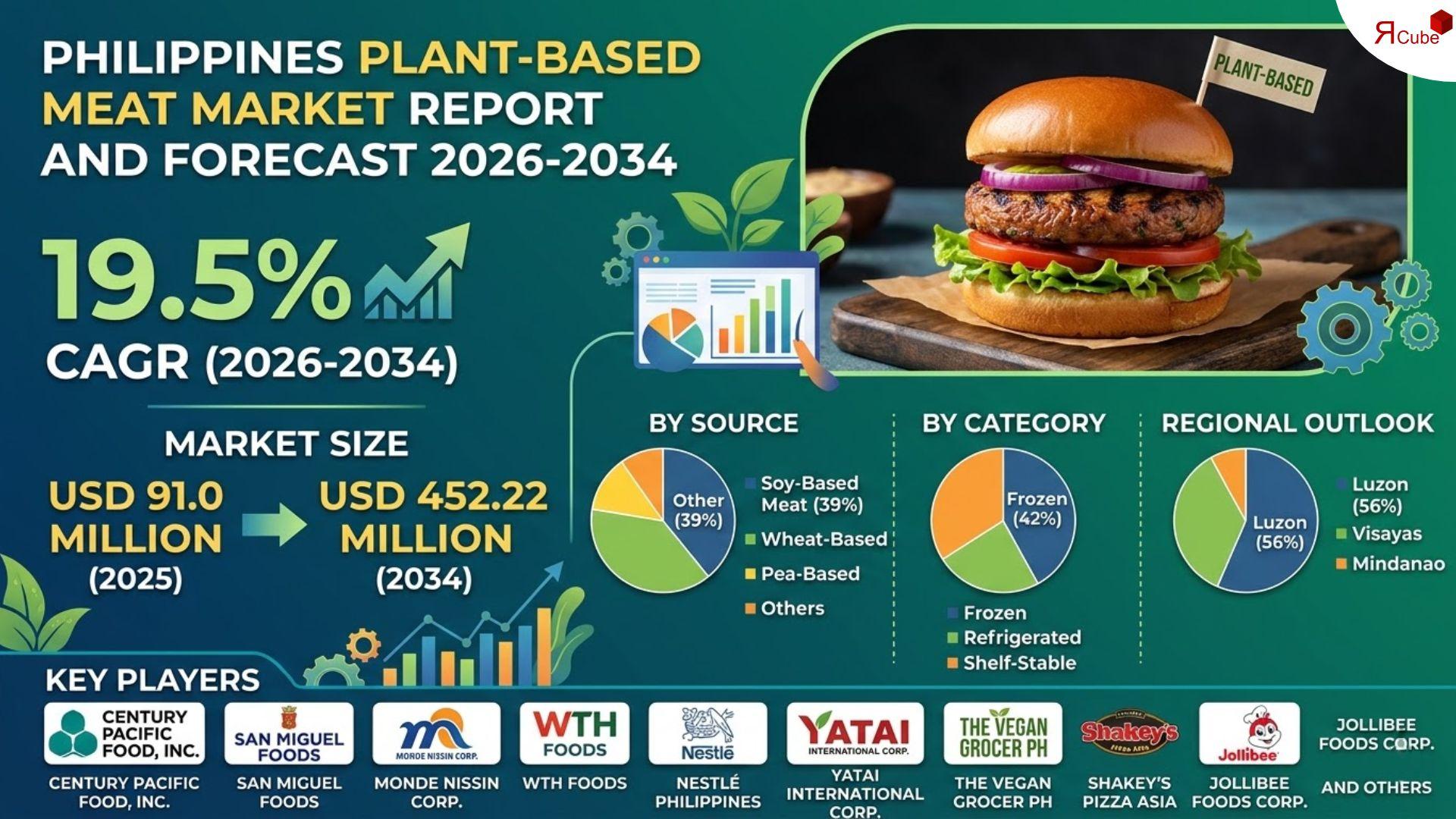 According to recent research report by The Report Cube, the size of Philippines Plant-Based Meat Market was nearly USD 91.0 Million in 2025, and by 2034 it is expected to reach around USD 452.22 Million with a CAGR of 19.5% over the forecast period (2026-2034).
