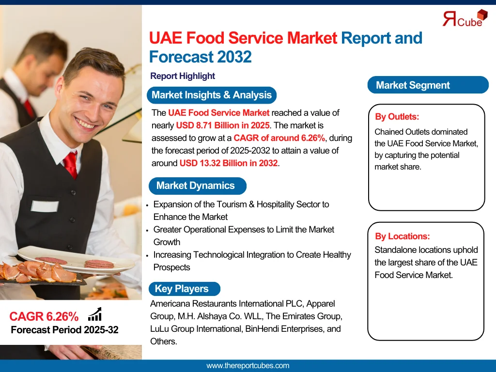 The Report Cube which is one of the leading market research company in UAE expects the UAE Food Service Market to grow at a CAGR of around 6.26% through 2032, as highlighted in their latest research report. The study provides an in-depth analysis of the emerging trends shaping the UAE Food Service Market and offers detailed forecasts for its potential growth during 2025–2032. The report also presents a comprehensive assessment of the competitive landscape, including profiles of leading players, their performance metrics, and recent strategic developments. Additionally, it explores the key market drivers, challenges, opportunities, and provides insights into historical and future revenue trends at the global, regional, and country levels.