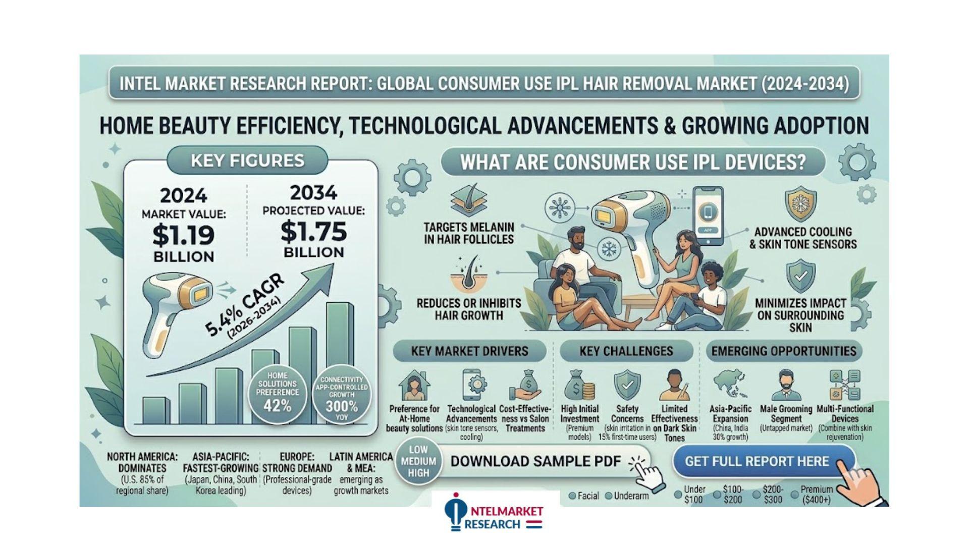 According to a new report from Intel Market Research, the global Consumer Use IPL (Intense Pulsed Light) Hair Removal market was valued at USD 1.19 billion in 2024 and is projected to reach USD 1.75 billion by 2034, growing at a CAGR of 5.4% during the forecast period (2025-2034). This growth is driven by increasing consumer preference for at-home beauty solutions, technological advancements in IPL devices, and rising disposable incomes in emerging markets.