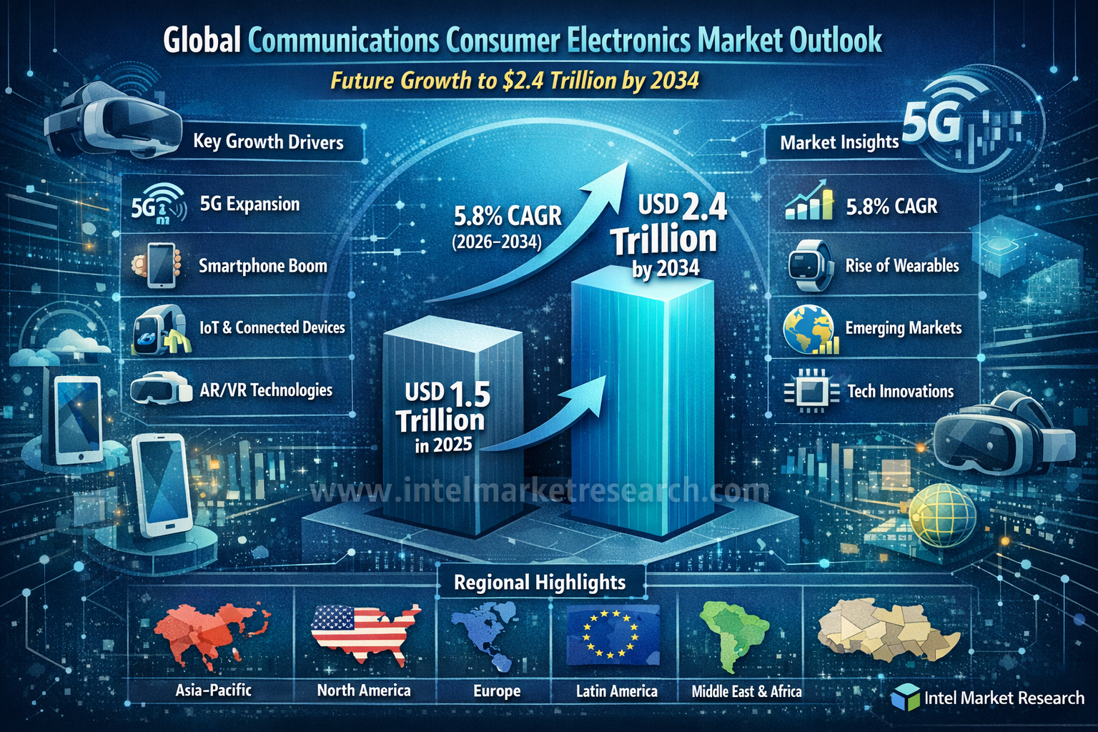 According to a new report from Intel Market Research, the global Communications Consumer Electronics market was valued at USD 1.5 trillion in 2025 and is projected to reach USD 2.4 trillion by 2034, growing at a steady CAGR of 5.8% during the forecast period (2026–2034). This expansion is fueled by accelerating 5G adoption, increasing smartphone penetration, and the proliferation of connected IoT devices across consumer and enterprise sectors.