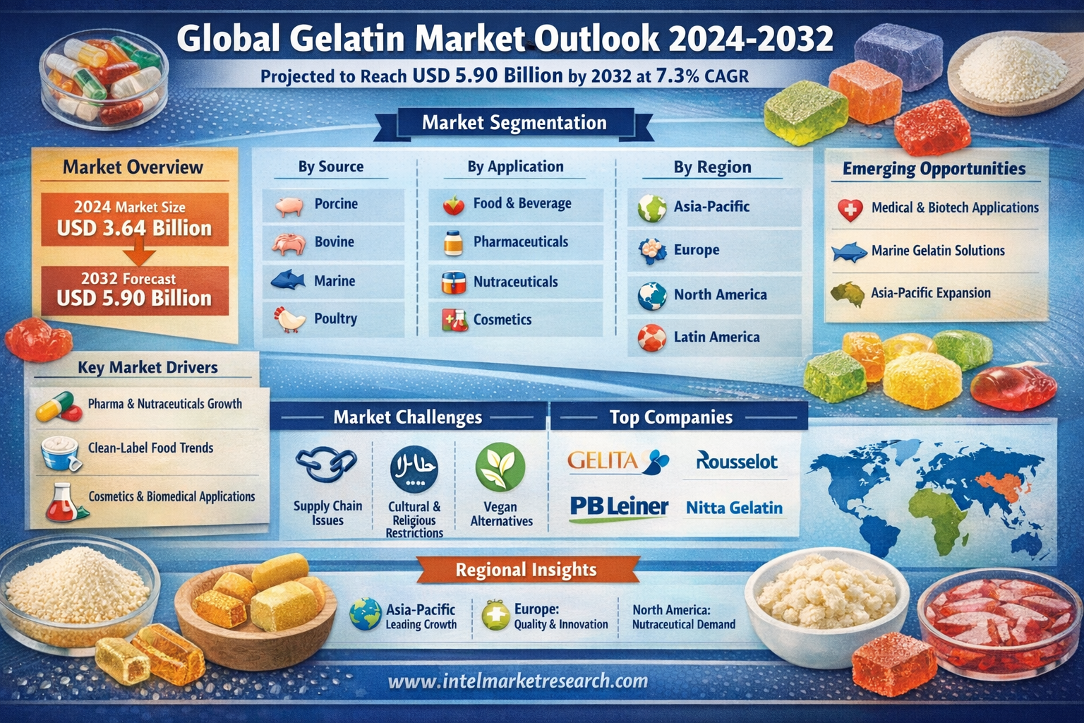 According to a new report from Intel Market Research, the global gelatin market was valued at USD 3.64 billion in 2024 and is projected to reach USD 5.90 billion by 2032, growing at a CAGR of 7.3% during the forecast period (2025-2032). This growth is fueled by increasing demand across food & beverage, pharmaceutical, and cosmetic applications, coupled with gelatin's versatile functional properties as a gelling agent, thickener, and stabilizer.