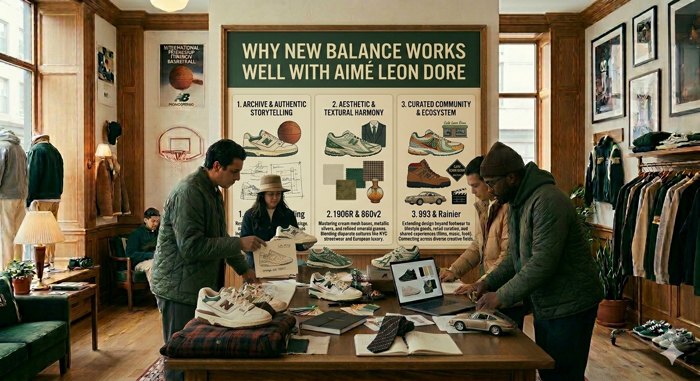 Aimé Leon Dore has a distinct design language that leans heavily on classic silhouettes, rich textures, and understated color palettes. This aligns perfectly with New Balance sneakers, which often carry a retro inspired yet modern aesthetic.