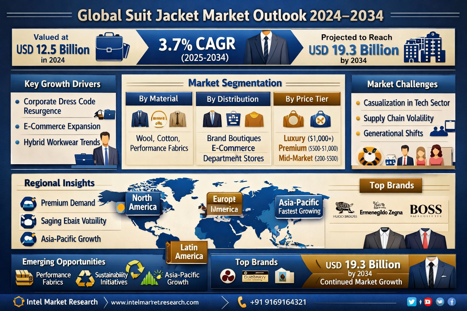- North America: Leads in premium fabric adoption and tailored fits, with stronghold markets in NYC and Chicago where financial services drive demand.