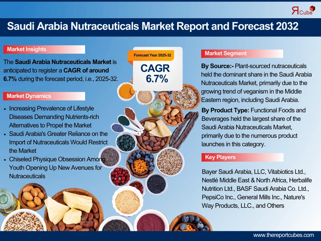 The Report Cube which is one of the leading market research company in UAE expects the Saudi Arabia Nutraceuticals Market to grow at a CAGR of around 6.7% through 2032, as highlighted in their latest research report. The study provides an in-depth analysis of the emerging trends shaping the Saudi Arabia Nutraceuticals Market and offers detailed forecasts for its potential growth during 2025–2032. The report also presents a comprehensive assessment of the competitive landscape, including profiles of leading players, their performance metrics, and recent strategic developments. Additionally, it explores the key market drivers, challenges, opportunities, and provides insights into historical and future revenue trends at the global, regional, and country levels.