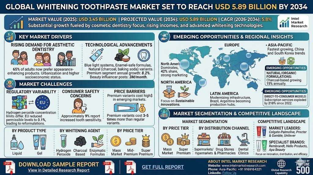 According to a new report from Intel Market Research, the global whitening toothpastes market was valued at USD 3.45 billion in 2025 and is projected to reach USD 5.89 billion by 2034, growing at a CAGR of 5.8% during the forecast period (2026–2034). This substantial growth is fueled by increasing consumer focus on cosmetic dentistry, rising disposable incomes in emerging economies, and continuous product innovations featuring advanced whitening technologies.