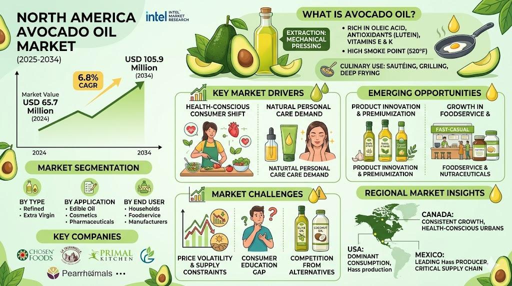 According to a new report from Intel Market Research, the North America Avocado Oil Market was valued at USD 65.7 million in 2024 and is projected to grow from USD 70.8 million in 2025 to USD 105.9 million by 2034, exhibiting a robust CAGR of 6.8% during the forecast period (2025–2034). This sustained expansion is driven by a powerful convergence of health-conscious consumer behavior, rising demand for clean-label food ingredients, and the growing incorporation of avocado oil across culinary, cosmetic, and nutraceutical applications throughout the region.