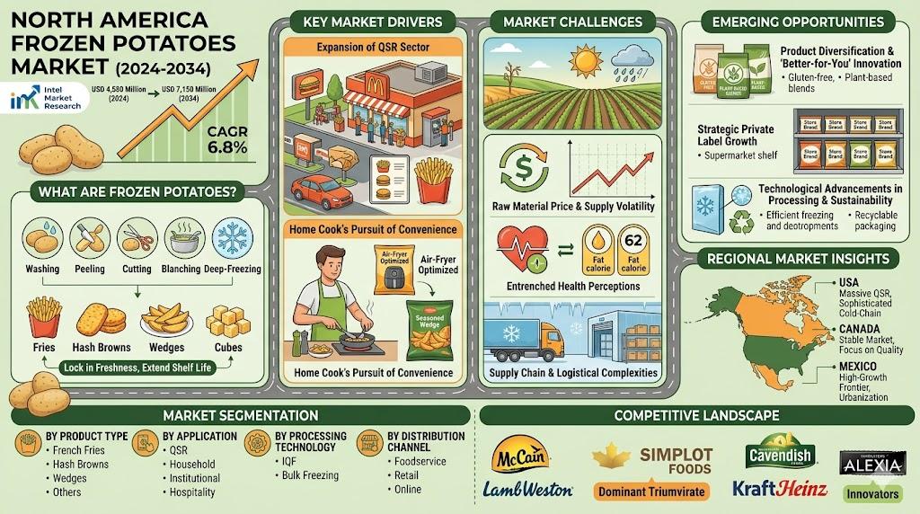 According to a new report from Intel Market Research, the North America Frozen Potatoes market was valued at USD 4,580 million in 2024 and is projected to reach USD 7,150 million by 2034, growing at a CAGR of 6.8% during the forecast period. This robust growth is fueled by the region's deep-rooted fast-food culture, relentless consumer demand for convenient meal solutions, and continuous innovation in frozen food processing and packaging technologies.