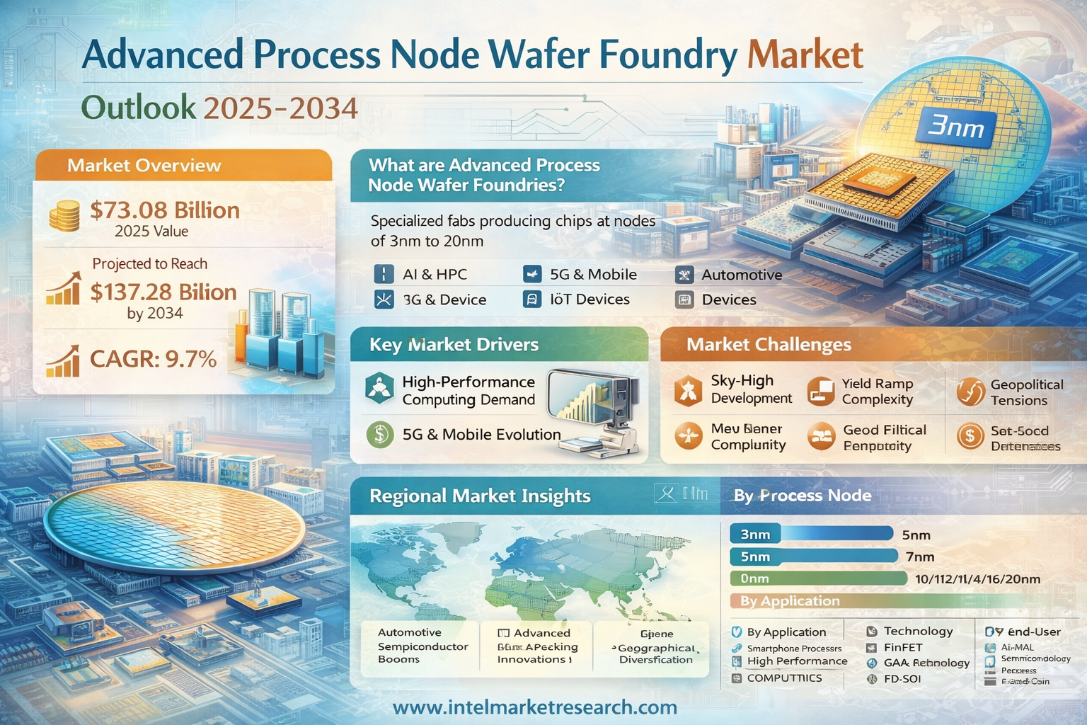 According to a new report from Intel Market Research, the global Advanced Process Node Wafer Foundry market was valued at USD 73.08 billion in 2025 and is projected to reach USD 137.28 billion by 2034, growing at a CAGR of 9.7% during the forecast period (2025–2034). This substantial growth is driven by escalating demand for high-performance semiconductors across AI, 5G, and IoT applications, coupled with massive investments in cutting-edge fabrication technologies.