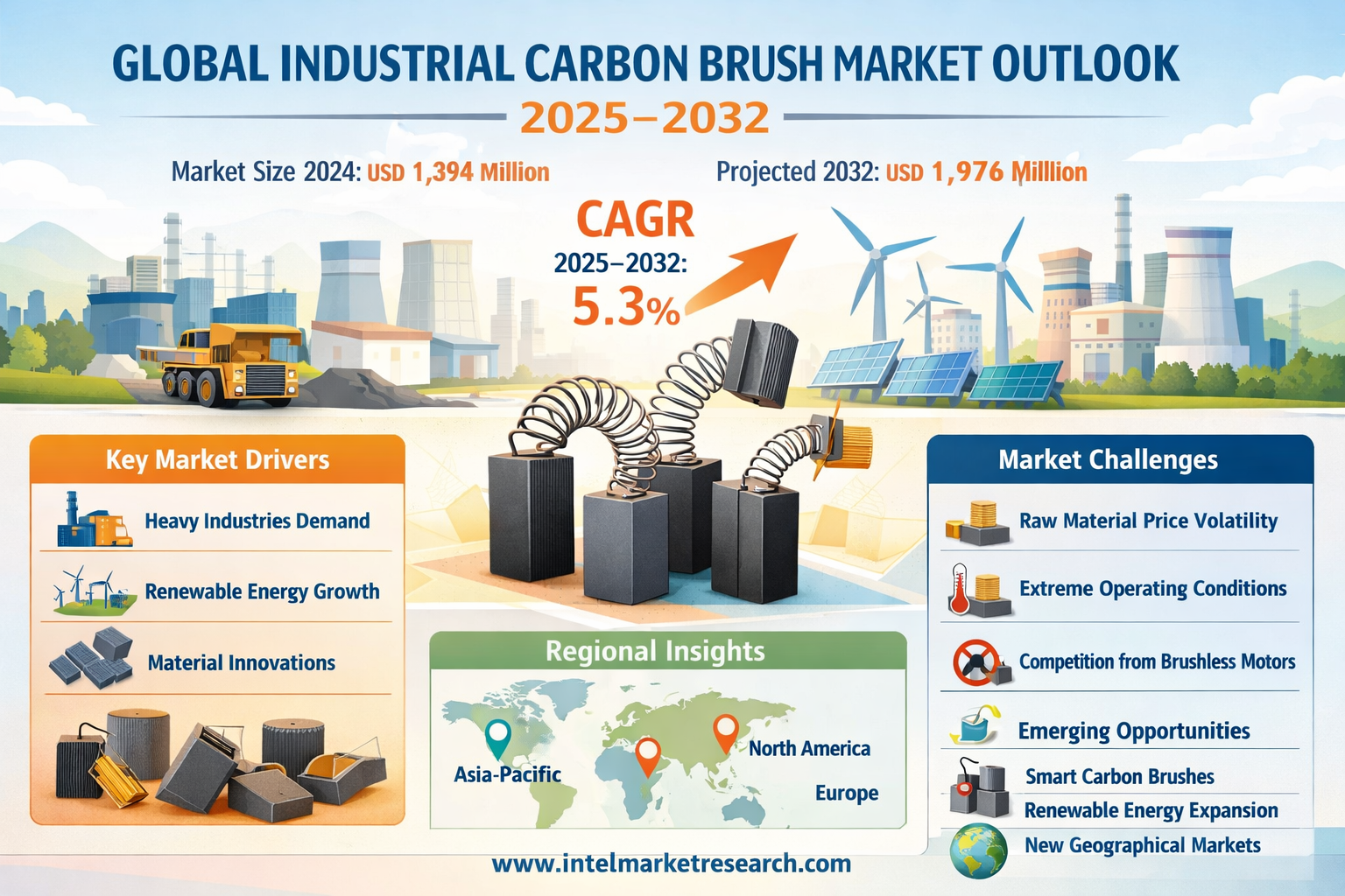 According to a new report from Intel Market Research, the global Industrial Carbon Brush market was valued at USD 1,394 million in 2024 and is projected to reach USD 1,976 million by 2032, growing at a robust CAGR of 5.3% during the forecast period (2025–2032). This growth is propelled by the accelerating pace of industrial automation, the rapid expansion of renewable energy infrastructure-particularly wind power-and the sustained demand from heavy industries such as steel, mining, and cement manufacturing that depend on reliable electrical machinery.