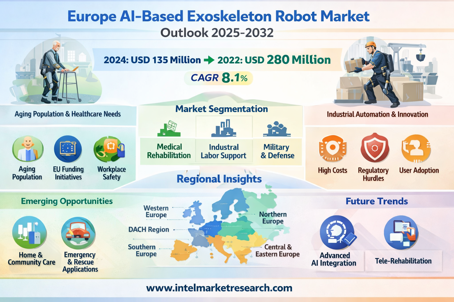 According to a new report from Intel Market Research, the Europe AI-based Exoskeleton Robot Market was valued at USD 135 million in 2024 and is projected to grow from USD 150 million in 2025 to USD 280 million by 2032, exhibiting a robust CAGR of 8.1% during the forecast period (2025–2032). This growth is propelled by the region's rapidly aging population, an intensifying focus on industrial automation, and substantial public and private investment in robotics research under landmark initiatives such as the EU's Horizon Europe program.