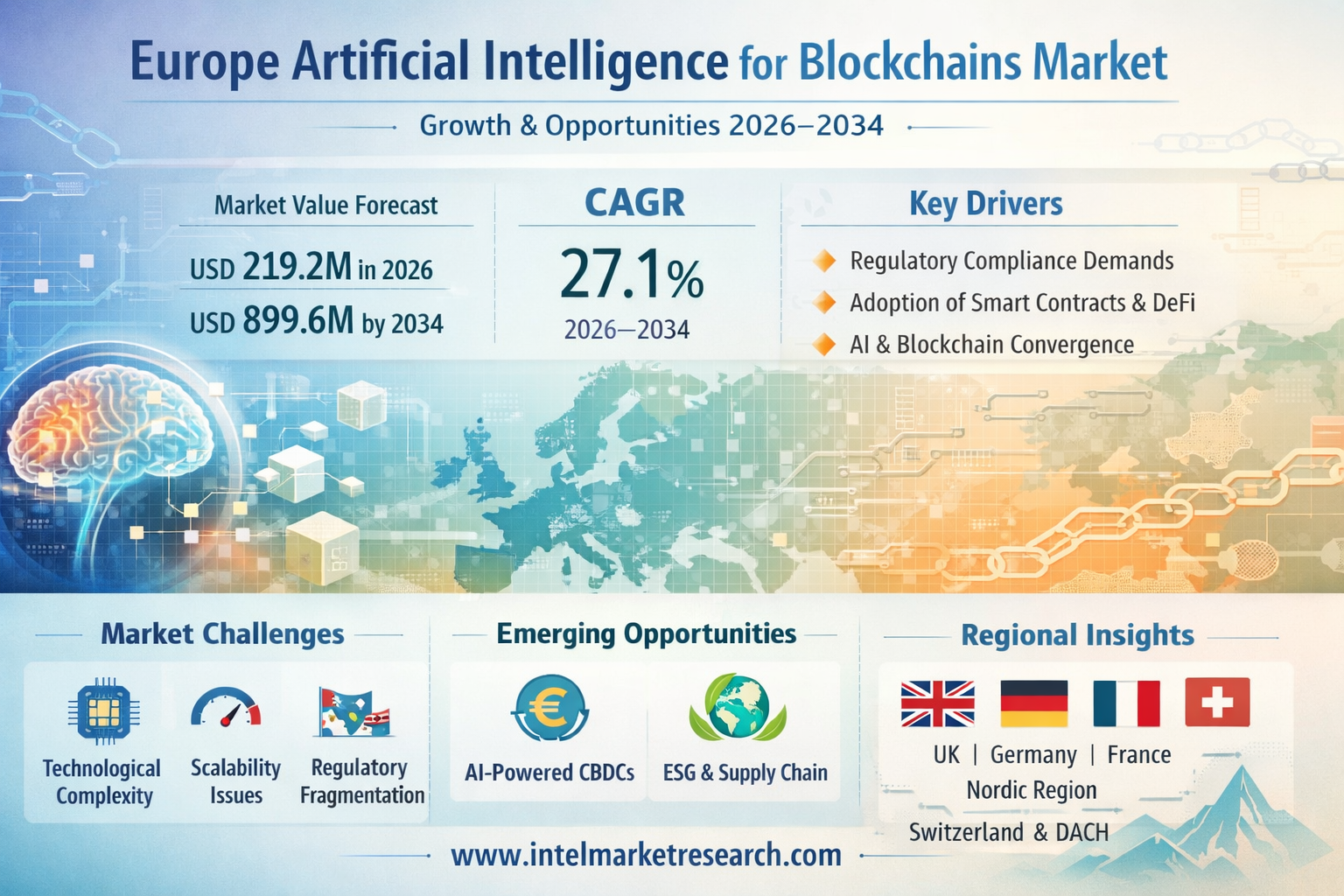 According to a new report from Intel Market Research, the Europe Artificial Intelligence for Blockchains market was valued at USD 170.8 million in 2025 and is projected to grow from USD 219.2 million in 2026 to USD 899.6 million by 2034, exhibiting a robust CAGR of 27.1% during the forecast period (2026–2034). This exceptional growth trajectory is driven by stringent regulatory compliance demands, surging adoption of intelligent risk management solutions across decentralized finance platforms, and the accelerating convergence of machine learning with distributed ledger technology across Europe's sophisticated financial ecosystem.