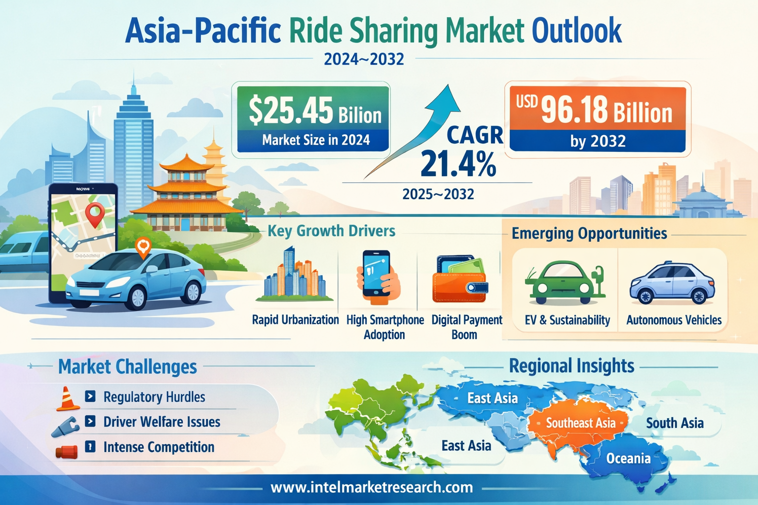 According to a new report from Intel Market Research, the Asia-Pacific ride sharing market was valued at USD 25.45 billion in 2024 and is projected to reach USD 96.18 billion by 2032, growing at a robust CAGR of 21.4% during the forecast period (2025–2032). This exceptional growth trajectory is propelled by rapid urbanization across densely populated economies, the accelerating adoption of smartphone-based mobility platforms, and a decisive regional shift away from private vehicle ownership toward flexible, on-demand transportation solutions.