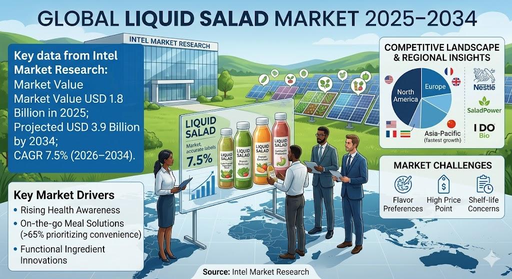 According to a new report from Intel Market Research, the global liquid salad market was valued at USD 1.8 billion in 2025 and is projected to reach USD 3.9 billion by 2034, growing at a healthy CAGR of 7.5% during the forecast period (2026–2034). This growth is driven by increasing health consciousness among consumers, demand for convenient nutrition solutions, and innovations in functional beverage formulations.