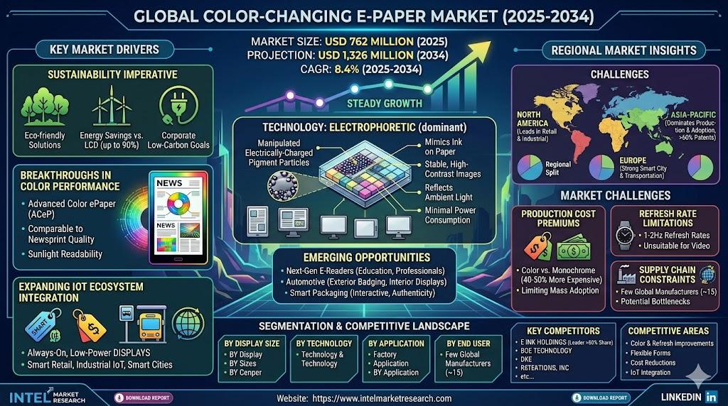 According to a new report from Intel Market Research, the global Color-Changing E-Paper market was valued at USD 762 million in 2025 and is projected to reach USD 1,326 million by 2034, growing at a steady CAGR of 8.4% during the forecast period (2025-2034). This growth trajectory reflects rising demand for energy-efficient display technologies across retail, consumer electronics, and advertising sectors.