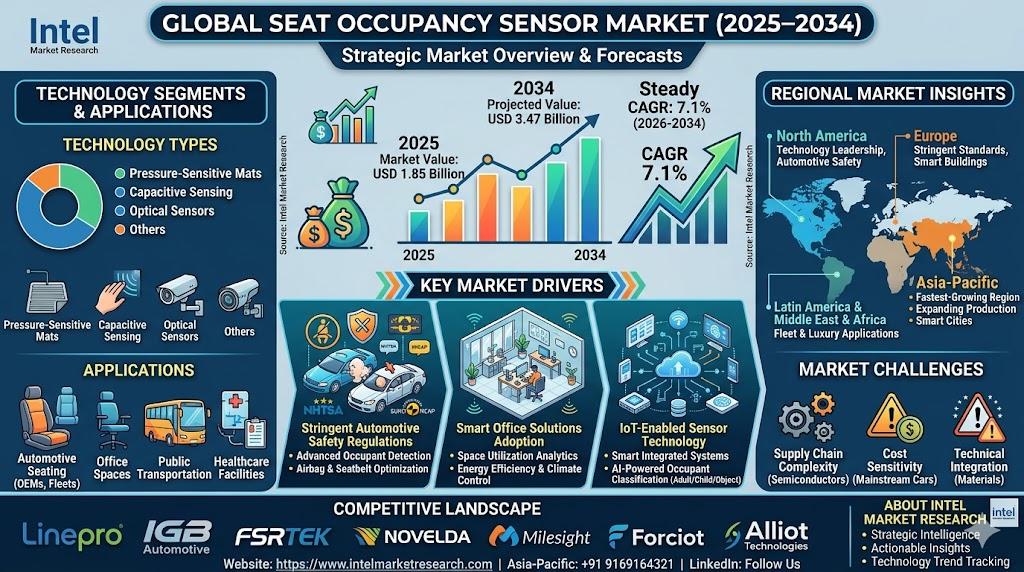 According to a new report from Intel Market Research, the global Seat Occupancy Sensor market was valued at USD 1.85 billion in 2025 and is projected to reach USD 3.47 billion by 2034, growing at a steady CAGR of 7.1% during the forecast period (2026-2034). This growth is driven by increasing automotive safety regulations, smart office solutions adoption, and advancements in IoT-enabled sensor technologies.