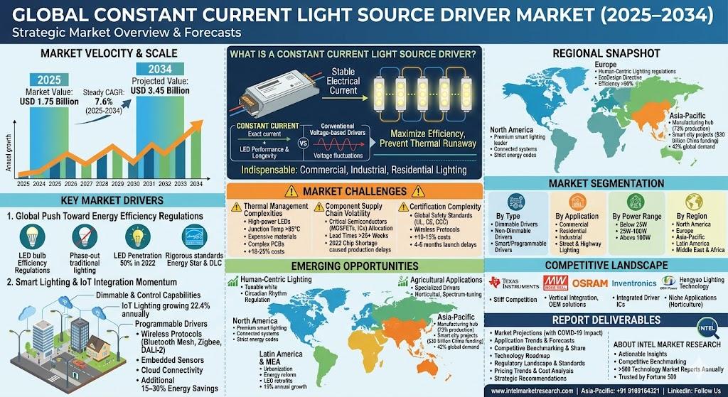 According to a new report from Intel Market Research, the global Constant Current Light Source Driver market was valued at USD 1.75 billion in 2025 and is projected to reach USD 3.45 billion by 2034, growing at a steady CAGR of 7.6% during the forecast period (2025–2034). This expansion is fueled by accelerating LED adoption worldwide, smart city lighting initiatives, and technological breakthroughs in driver efficiency.