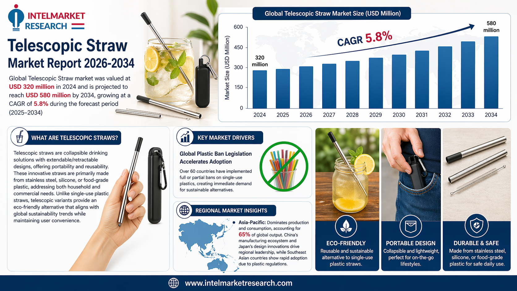 According to a new report from Intel Market Research, the global Telescopic Straw market was valued at USD 320 million in 2024 and is projected to reach USD 580 million by 2034, growing at a CAGR of 5.8% during the forecast period (2025–2034). This growth is fueled by increasing environmental awareness, plastic ban regulations across 60+ countries, and rising demand from the food service industry.
