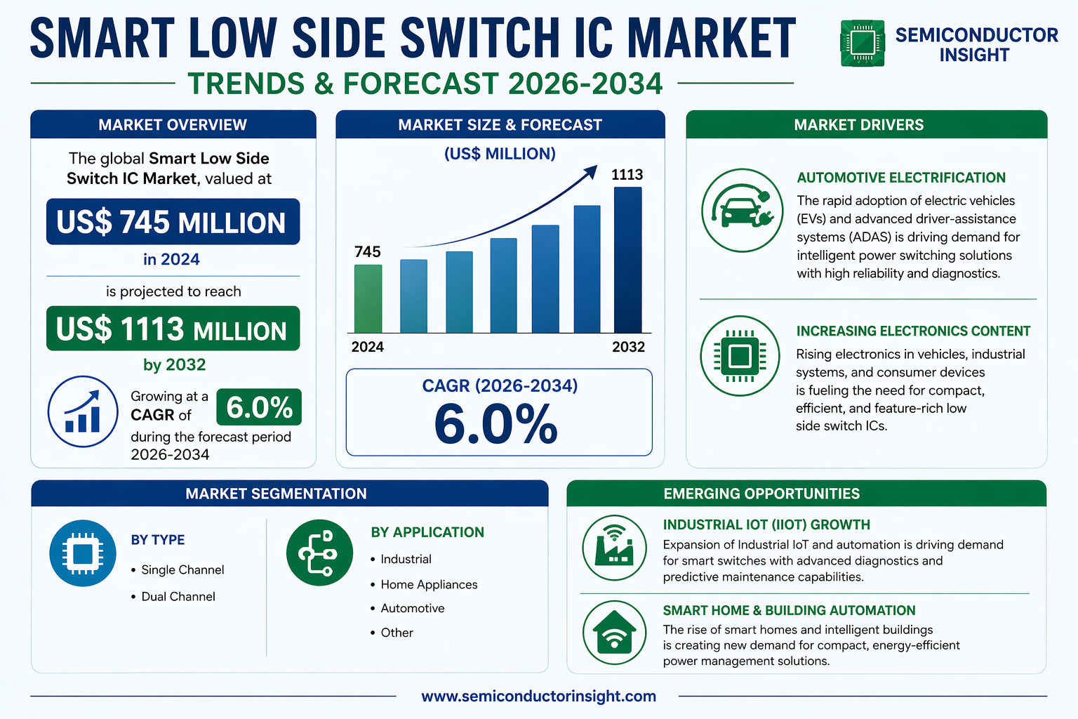 Global Smart Low Side Switch IC Market, valued at US$ 745 million in 2024, is poised for steady expansion, projected to reach US$ 1113 million by 2032. This growth, representing a compound annual growth rate (CAGR) of 6.0%, is detailed in a comprehensive new report published by Semiconductor Insight. The study underscores the critical role these intelligent power management components play in enhancing efficiency, reliability, and safety across a vast range of electronic applications, from advanced automotive systems to industrial automation.