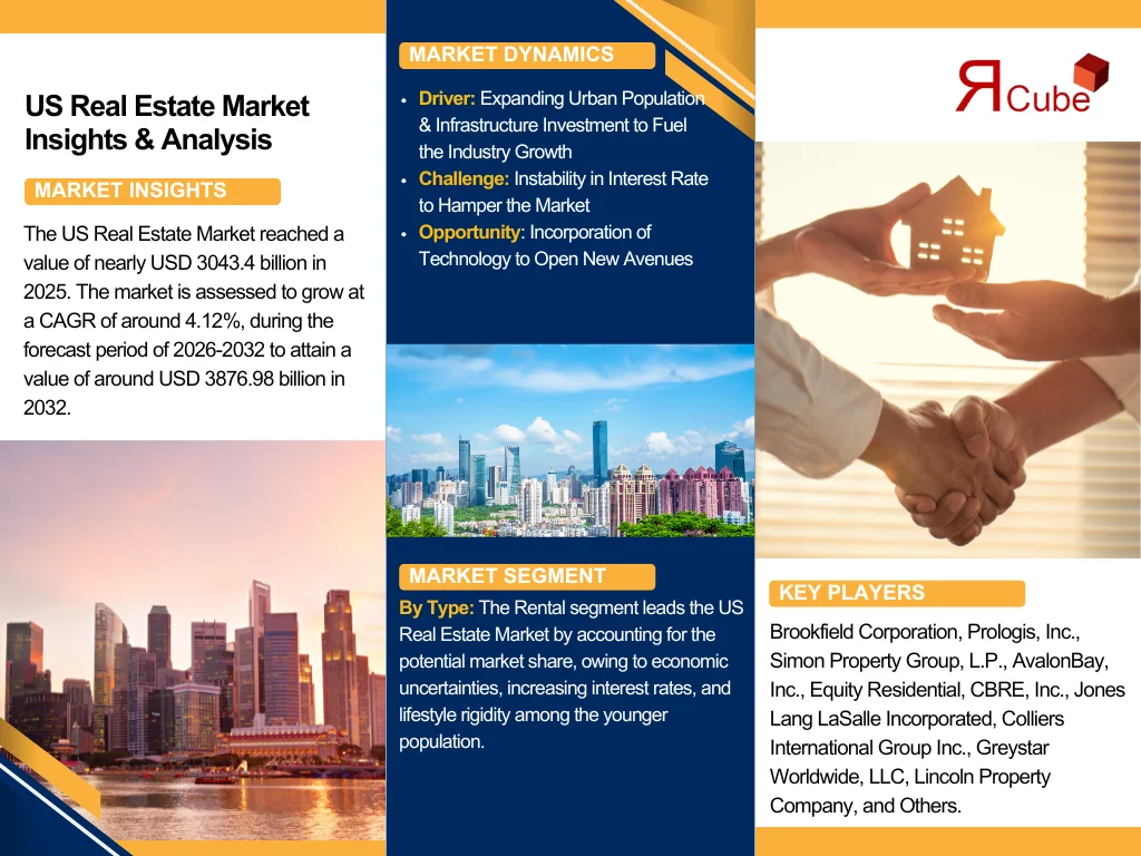 The Report Cube which is one of the leading market research company in UAE expects the US Real Estate Market to grow at a CAGR of around 4.12% through 2032, as highlighted in their latest research report. The study provides an in-depth analysis of the emerging trends shaping the US Real Estate Market and offers detailed forecasts for its potential growth during 2026–2032. The report also presents a comprehensive assessment of the competitive landscape, including profiles of leading players, their performance metrics, and recent strategic developments. Additionally, it explores the key market drivers, challenges, opportunities, and provides insights into historical and future revenue trends at the global, regional, and country levels.
