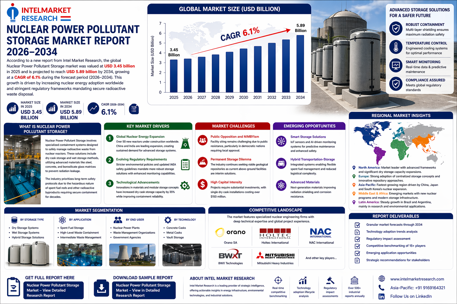According to a new report from Intel Market Research, the global Nuclear Power Pollutant Storage market was valued at USD 3.45 billion in 2025 and is projected to reach USD 5.89 billion by 2034, growing at a CAGR of 6.1% during the forecast period (2026–2034). This growth is driven by increasing nuclear energy adoption worldwide and stringent regulatory frameworks mandating secure radioactive waste disposal.
