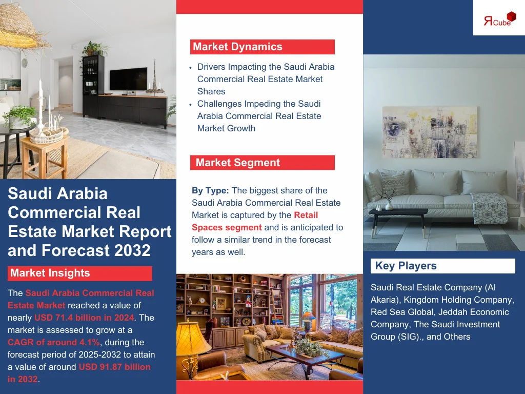 The Report Cube which is one of the leading market research company in UAE expects the Saudi Arabia Commercial Real Estate Market to grow at a CAGR of around 4.1% through 2032, as highlighted in their latest research report. The study provides an in-depth analysis of the emerging trends shaping the Saudi Arabia Commercial Real Estate Market and offers detailed forecasts for its potential growth during 2025–2032. The report also presents a comprehensive assessment of the competitive landscape, including profiles of leading players, their performance metrics, and recent strategic developments. Additionally, it explores the key market drivers, challenges, opportunities, and provides insights into historical and future revenue trends at the global, regional, and country levels.