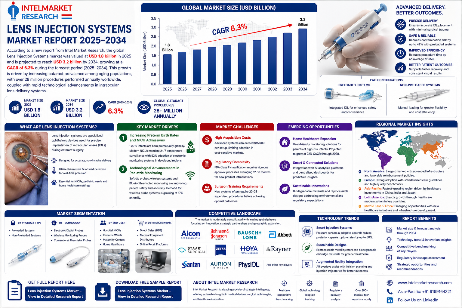 According to a new report from Intel Market Research, the global Lens Injection Systems market was valued at USD 1.8 billion in 2025 and is projected to reach USD 3.2 billion by 2034, growing at a CAGR of 6.3% during the forecast period (2025–2034). This growth is driven by increasing cataract prevalence among aging populations, with over 28 million procedures performed annually worldwide, coupled with rapid technological advancements in intraocular lens delivery systems.