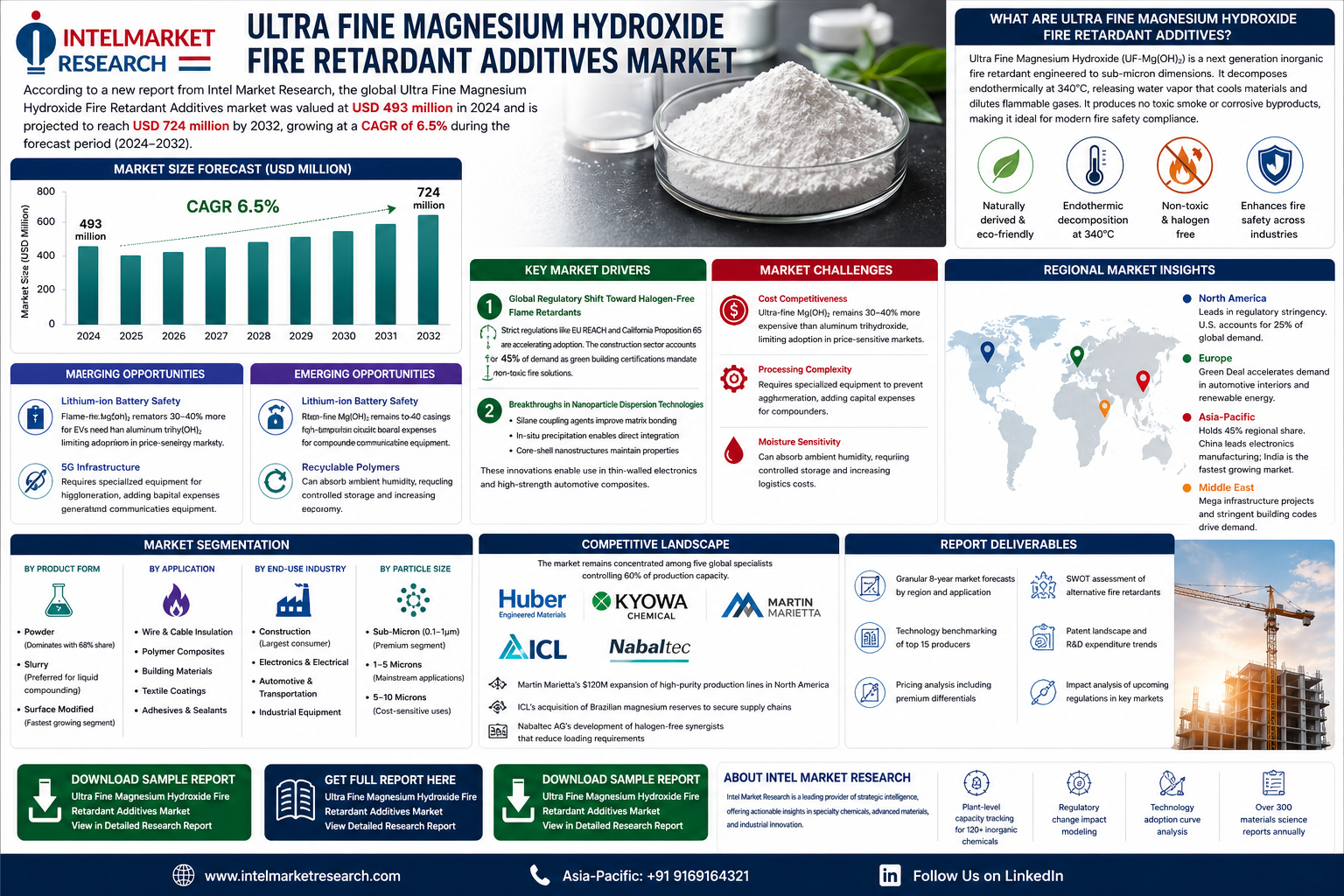 According to a new report from Intel Market Research, the global Ultra Fine Magnesium Hydroxide Fire Retardant Additives market was valued at USD 493 million in 2024 and is projected to reach USD 724 million by 2032, growing at a CAGR of 6.5% during the forecast period (2024–2032). This growth is driven by stringent environmental regulations, increasing demand for non-halogenated flame retardants, and expanding applications in construction, electronics, and automotive sectors.