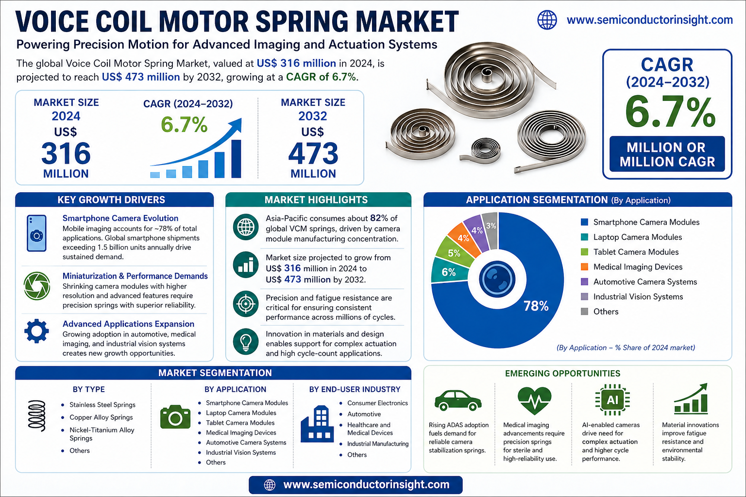 Global Voice Coil Motor Spring Market, valued at US$ 316 million in 2024, demonstrates steady growth potential with projections reaching US$ 473 million by 2032. This expansion, reflecting a compound annual growth rate (CAGR) of 6.7%, is detailed in a comprehensive new report published by Semiconductor Insight. The study emphasizes the critical role these precision components play in enabling advanced autofocus and optical image stabilization systems across consumer electronics and specialized industrial applications.
