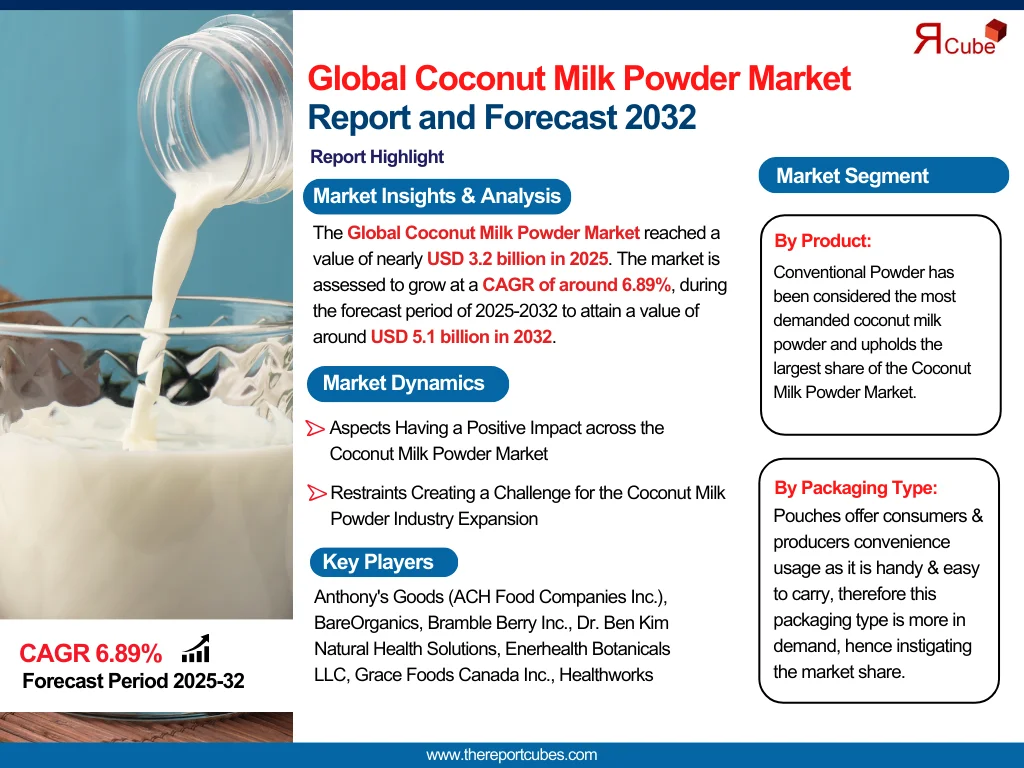 The latest research report on the Global Coconut Milk Powder Market reveals significant growth potential, with the market projected to reach USD 5.1 billion by 2032, growing at a CAGR of approximately 6.89% during the forecast period. Rising consumer preference for dairy alternatives drives market expansion, supported by increasing health awareness regarding lactose intolerance and veganism. This report provides comprehensive insights into market dynamics, driving trends, and competitive landscape, making it essential for stakeholders aiming to align with market opportunities.