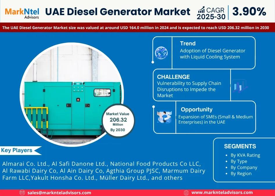 MarkNtel Advisors, a leading market research and consulting firm, has announced the release of its latest study titled UAE Diesel Generator Market Research Report: Forecast (2025–2030). This report provides a detailed assessment of the UAE Diesel Generator, covering its evolving dynamics, emerging trends, key growth drivers, major challenges, and competitive landscape.