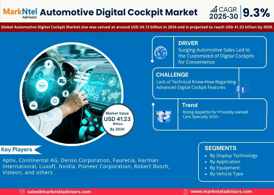 MarkNtel Advisors, a leading market research and consulting firm, has announced the release of its latest study titled Automotive Digital Cockpit Market Research Report: Forecast (2025–2030). This report provides a detailed assessment of the Automotive Digital Cockpit, covering its evolving dynamics, emerging trends, key growth drivers, major challenges, and competitive landscape.