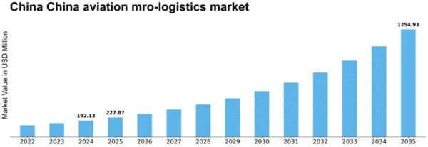 The future of the China Aviation MRO Logistics Market appears especially bright, backed by robust forecasts, favorable industry dynamics, and accelerating demand across civil and military aviation sectors. According to projections, the China MRO-logistics market is expected to grow from approximately USD 227.87 million in 2025 to USD 1,254.93 million by 2035, representing a striking compound annual growth rate (CAGR) of 18.6% over the forecast period.