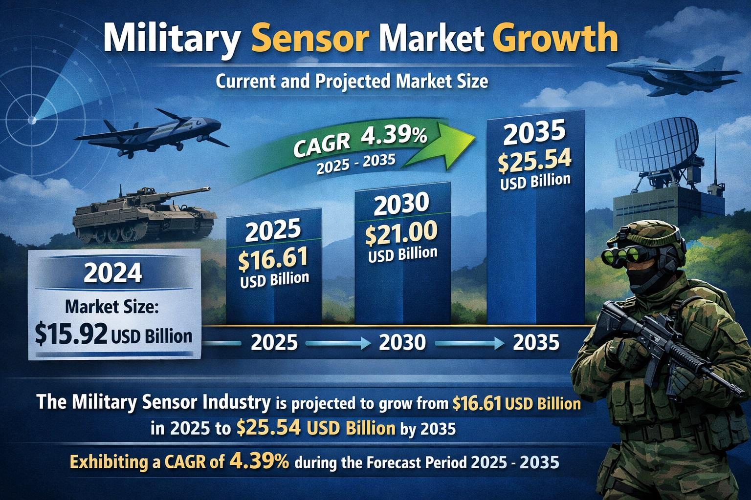 As per MRFR analysis, the Military Sensor Market Size was estimated at 15.92 USD Billion in 2024. The Military Sensor industry is projected to grow from 16.61 USD Billion in 2025 to 25.54 USD Billion by 2035, exhibiting a compound annual growth rate (CAGR) of 4.39 during the forecast period 2025 - 2035. Unmanned Aerial Vehicles (UAVs) are the face of modern war. The Military Sensor Market provides the intelligence these drones gather.