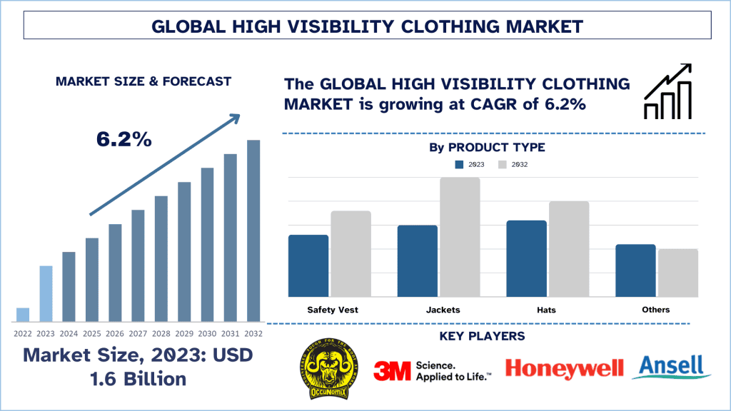 The High Visibility Clothing Market was valued at approximately ~USD 1.6 Billion in 2023 and is expected to grow at a strong CAGR of around 6.2% during the forecast period (2024-2032)