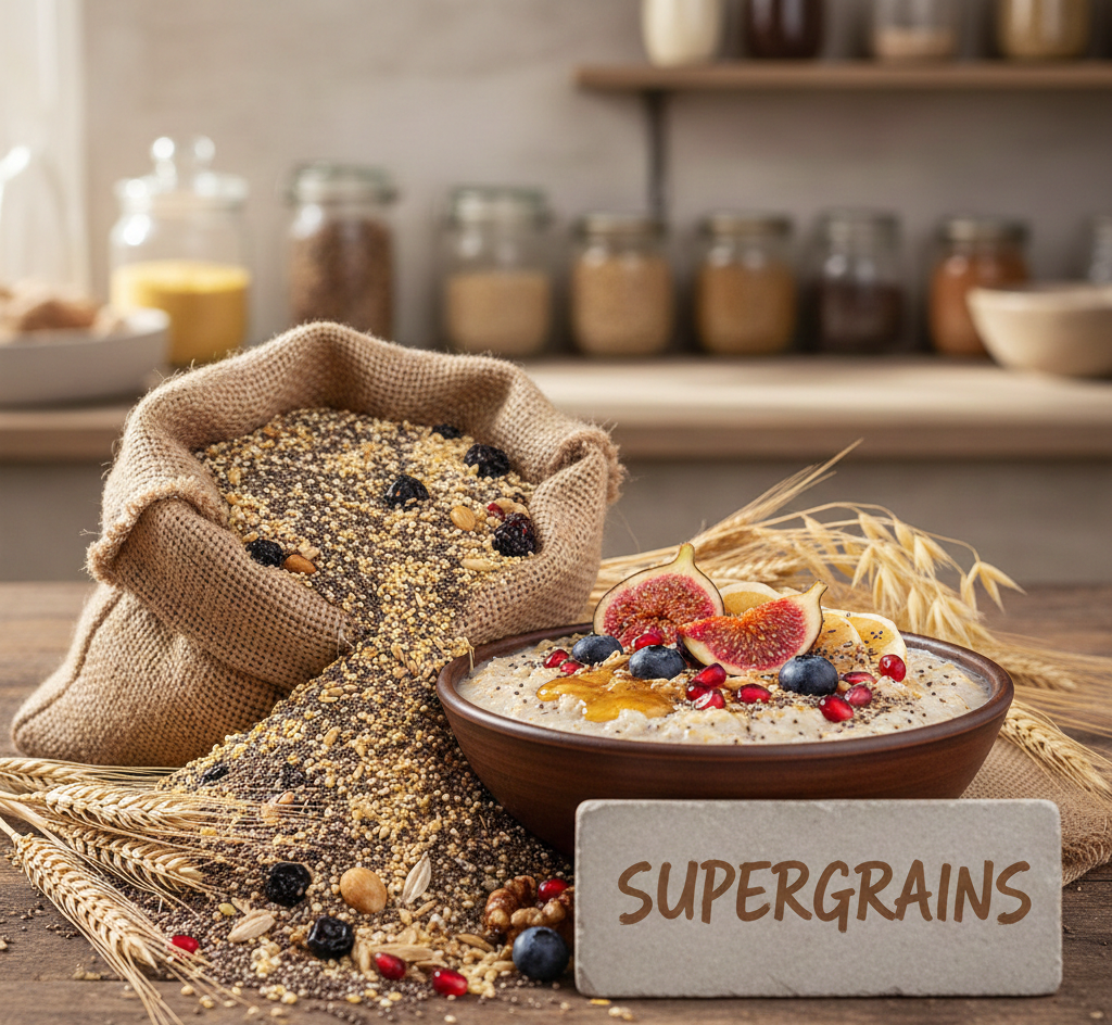 Supergrains are nutrient‑rich ancient grains and seeds, such as quinoa, amaranth, teff, and millet, known for their high protein, fiber, and micro‑nutrient profiles.