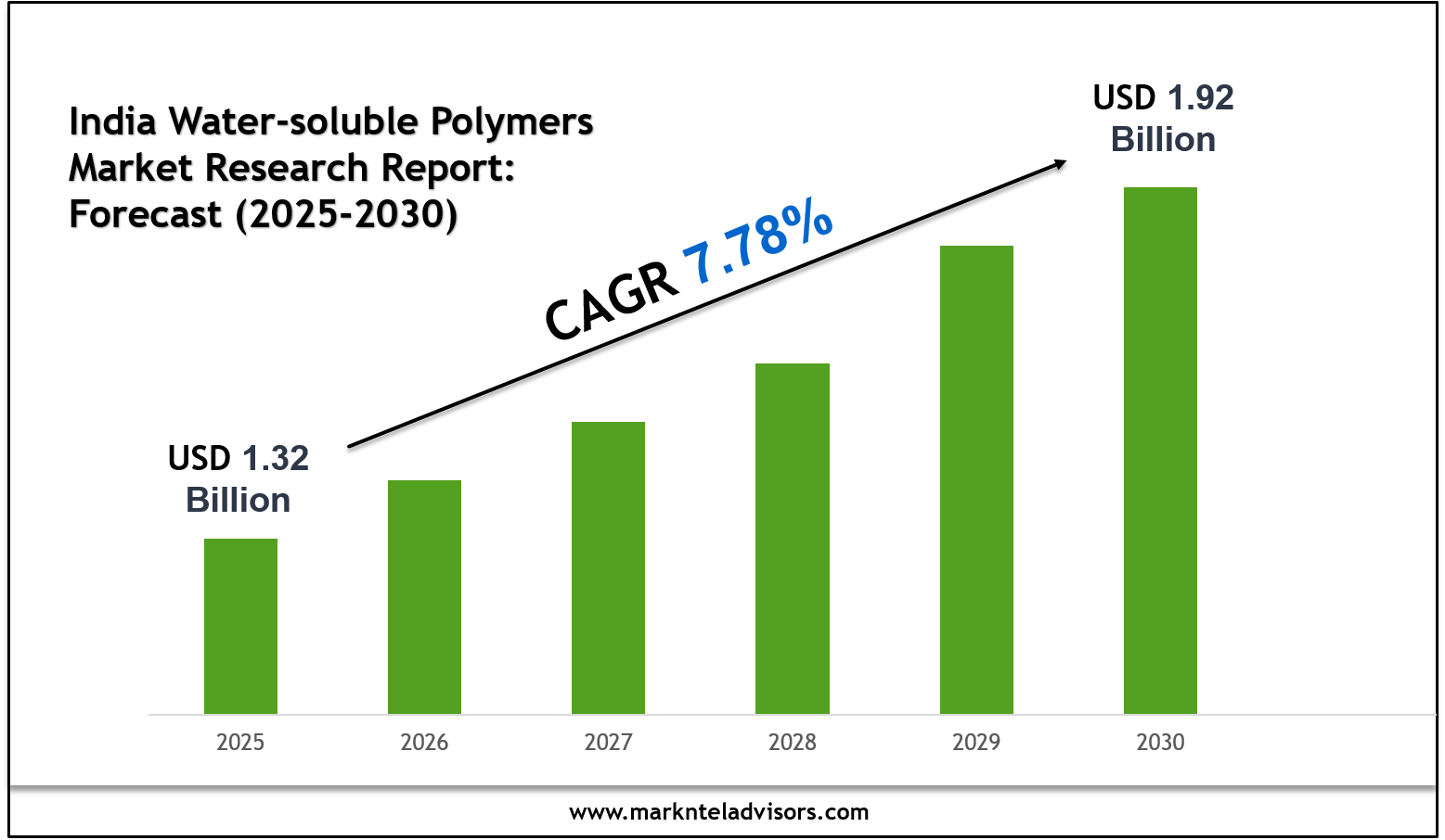 The India Water-soluble Polymers Market size is valued at around USD 1.32 billion in 2025 and is projected to reach USD 1.92 billion by 2030. Along with this, the market is estimated to grow at a CAGR of around 7.78% during the forecast period, i.e., 2025-30.