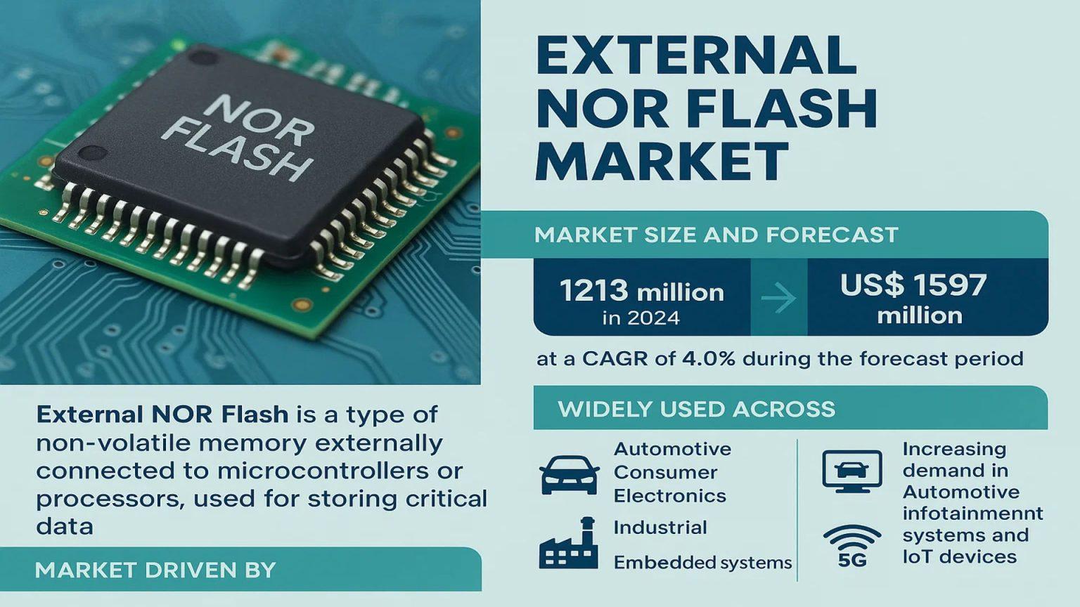 The External NOR Flash Market covers discrete NVM components augmenting host processor memory hierarchies for code storage/execution, propelled by 50B embedded endpoints requiring 256MB+ aggregate flash by 2030 and ISO 26262 ASIL-D functional safety certification.