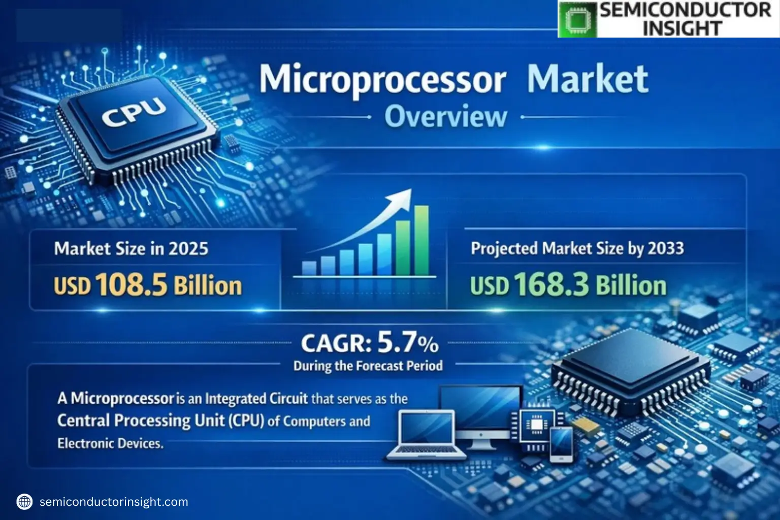 Global Microprocessor Market was valued at USD 108.5 billion in 2026 and is projected to reach USD 168.3 billion by 2034, exhibiting a CAGR of 5.7% during the forecast period 2026-2034. This expansion tracks sustained adoption across data centers, embedded systems, and mobile platforms.